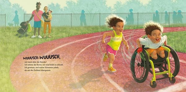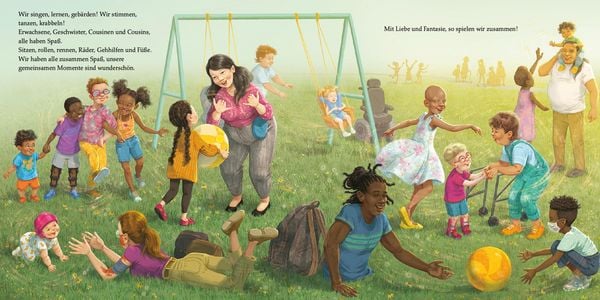 "Alle spielen mit!" erzählt von Kindern und Erwachsenen, die trotz körperlicher Unterschiede zusammen lachen, entdecken und träumen. Denn mit ein bisschen Fantasie und Kreativität wird jedes Spiel zu einem Ort, an dem alle willkommen sind. Dieses warmherzige Buch zeigt, wie die Freude am Spielen Barrieren überwindet und Gemeinschaft schafft - egal, ob man sitzt, läuft, rollt oder springt.