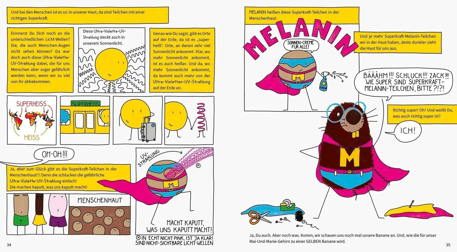 In diesem Sach-Bilderbuch haben Mai Thi Nguyen-Kim und Marie Meimberg auf über 100 Seiten all ihr Wissen in Antworten und Bildern vereint. Wenn du dieses Buch liest, wirst du verstehen, in welchen Farben der Regenbogen für dich leuchtet und was das mit Licht, Wellen und aufgeregten Zapfen zu tun hat. Du wirst verstehen: Diese scheinbar kleine Frage ist mit unserem Gehirn, Clown-Fangschreckenkrebsen und Bananen verbunden. Denn Bananen haben zwar eine Bananen-Form. Aber eine Bananen-Farbe, die haben sie eigentlich nicht. Diese scheinbar kleine Frage steckt voller Surf-Träume, Box-Schmerzen und Wirklichkeits-Wahrnehmung. Deswegen ist sie auch mit Möwen und Ottern verbunden. Und mit uns Menschen. Wen wir lieben. Und wie bunt unsere Liebe ist.