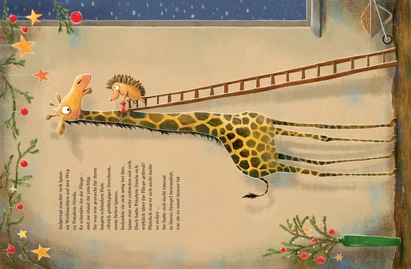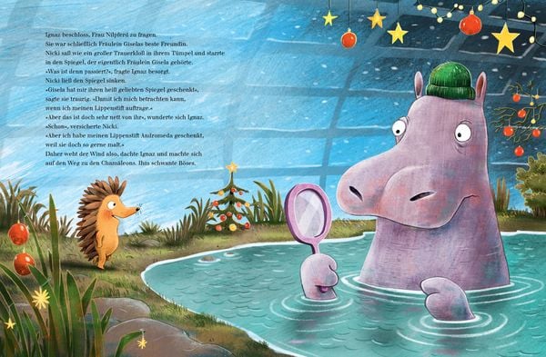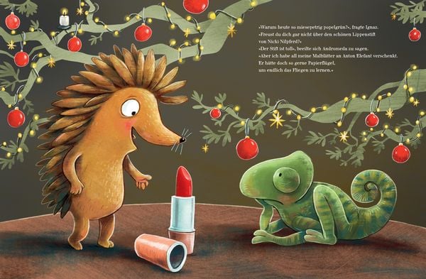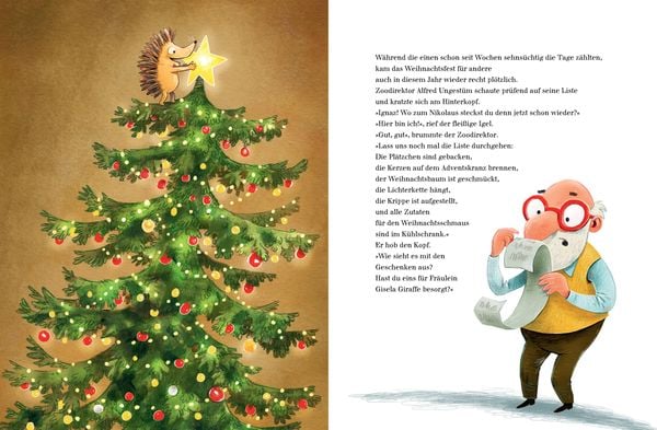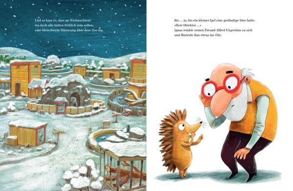 Weihnachten steht vor der Tür, und die Zootiere wollen wichteln! Ignaz Pfefferminz Igel, Zoodirektor Ungestüm und die anderen grübeln: Was ist nur das perfekte Geschenk? Ignaz beschließt, der Giraffe seine Fliege zu schenken. Die Giraffe würde sich gerne damit in ihrem Spiegel betrachten, doch dummerweise hat sie den gerade dem Nilpferd geschenkt. Das wiederum hat seinen Lippenstift dem Chamäleon gegeben, weil es doch so gerne malt. Und so geht das immer weiter ... Wie gut, dass Ignaz eine Lösung weiß! So kommen alle beim großen Fest zusammen und teilen ihre Geschenke einfach miteinander. Denn geteilte Freude ist doch die schönste Freude - erst recht an Weihnachten!