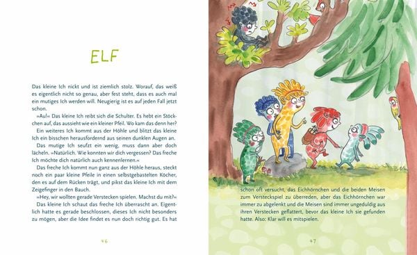 Genauso geht es dem Kleinen Ich: Tausend Fragen gehen ihm täglich durch den Kopf. Besonders die eine: Werde ich immer das kleine Ich sein? Das Kleine Ich braucht dringend jemanden, mit dem es reden kann. So beschließt das Kleine Ich sich auf die Suche nach anderen Ichs zu machen. Schon nach kurzer Zeit trifft es das wütende Ich, das glückliche, das ängstliche, das freche und das mutige Ich. Jedes Ich ist ganz eigen und doch sind sie sich ähnlich: Im mutigen Ich steckt auch ein bisschen vom ängstlichen Ich und das wütende Ich kann auch glücklich sein.