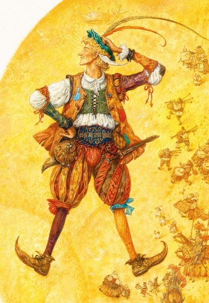 Dieser Wagehals wird einfach den bösen Riesen besiegen, ein wütendes Einhorn zähmen und einen riesigen Eber in eine Falle locken. Und wenn sie fragen, wird er ihnen eine Hose und eine Weste nähen, die so schön sind, dass Sie Ihren Augen nicht trauen. Auf seinem Gürtel steht die berühmte Devise "Sieben auf einen Streich".