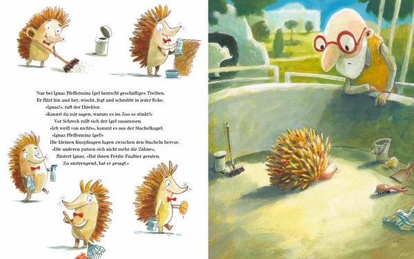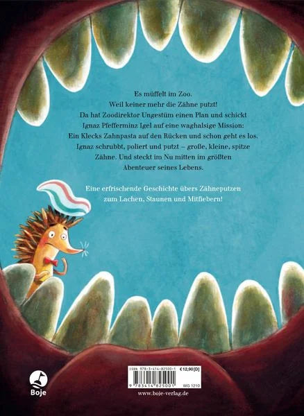 Es müffelt im Zoo. Weil keiner mehr die Zähne putzt! Da hat Zoodirektor Ungestüm einen Plan - und schickt Ignaz Pfefferminz Igel auf eine waghalsige Mission: Ein Klecks Zahnpasta auf den Rücken und schon geht es los. Ignaz schrubbt, poliert und putzt - große, kleine, spitze Zähne. Und steckt im Nu mitten im größten Abenteuer seines Lebens. Dabei traut er sich hoch hinauf zu Frau Giraffe, ins Löwengehege und sogar bis ins Maul von Wilhelm, dem weißen Hai!