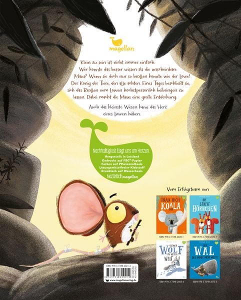 Klein zu sein ist nicht immer einfach. Wer könnte das besser wissen als die Maus? Man wird vergessen, übersehen und geschubst. Wenn sie doch nur so brüllen könnte wie der Löwe, dann würde ihr das nicht mehr passieren! Sie fasst all ihren Mut zusammen und beschließt, den mächtigen Löwen zu besuchen. Denn wer könnte ihr das Brüllen besser beibringen als der Löwe? Am Ende ihrer abenteuerlichen Reise macht die Maus eine Entdeckung: Man muss gar nicht groß und stark sein, um seine Ängste zu überwinden.