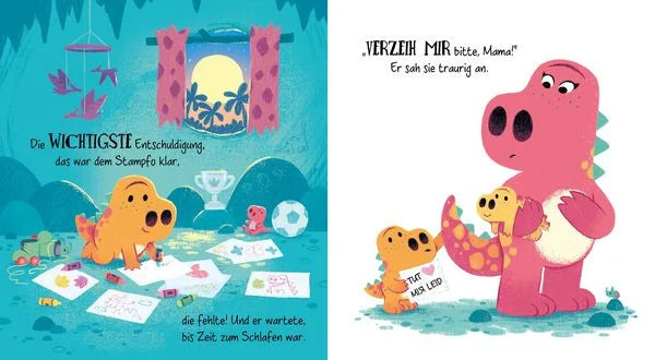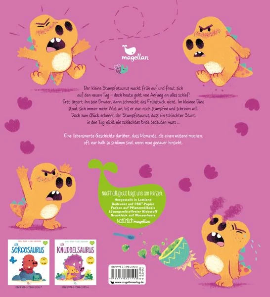 Der kleine Stampfosaurus wacht früh auf und freut sich auf den neuen Tag - doch heute geht von Anfang an alles schief! Erst ärgert ihn sein Bruder, dann schmeckt das Frühstück nicht. Im kleinen Dinosaurier staut sich immer mehr Wut an, bis er nur noch stampfen und schreien will. Doch zum Glück erkennt der Stampfosaurus, dass ein schlechter Start in den Tag nicht ein schlechtes Ende bedeuten muss ...
