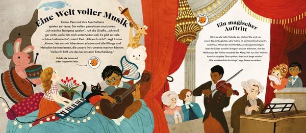 Emma und Paul entdecken in diesem liebevoll illustrierten Buch auf einer Zeitreise durch Länder und Epochen verschiedene Musikinstrumente - und lernen bekannte Musikstücke kennen, in denen diese Instrumente die "Hauptrolle" spielen. So lauschen sie etwa Beethovens Violinen aus dem Wien des 19. Jahrhunderts, Teresa Carreños venezolanischen Klavierklängen, jazzigen Saxophonen oder Cécile Charminades Flöten. Auf jeder Seite lernen Emma und Paul spannende Fakten über die einzelnen Instrumente und wie sie inszeniert werden. Und am Ende finden sich alle Instrumente zu einem große Orchester zusammen.