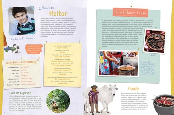 Entdecke den Geschmack der Welt und lerne 13 Kinder aus verschiedenen Ländern kennen: Wie leben Niika in Japan oder Feven in Äthiopien und was essen sie am liebsten? Welche Lieblingsrezepte haben Heitor aus Brasilien oder Gurmeet aus Indien? Einfache landestypische Rezepte laden mit Zutatenliste und Schritt-für-Schritt-Fotos zum Nachkochen ein.