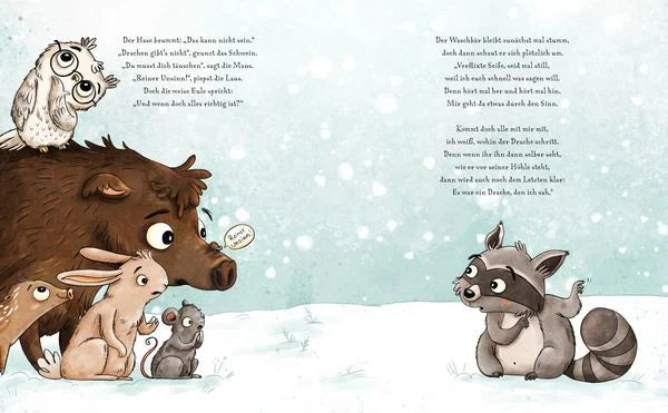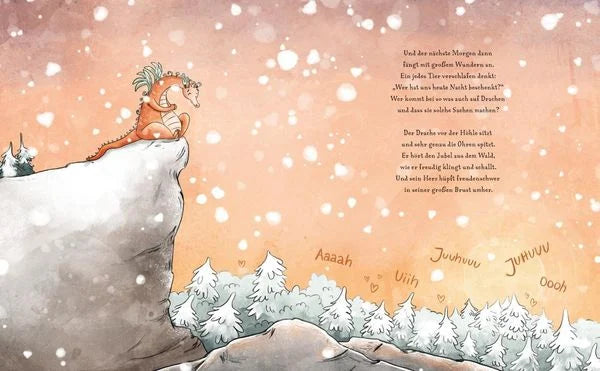 Der Drache wohnt ganz allein in seiner Höhle im Wald und wünscht sich jedes Jahr nichts sehnlicher, als mit allen anderen Tieren gemeinsam Weihnachten zu feiern. Leider haben die anderen Tiere Angst vor ihm! Der Drache ist deswegen aber nicht beleidigt, höchstens ein bisschen traurig. Und weil er den anderen Tieren ja trotzdem eine Freude machen will, weil er sie mag und ihnen ein schönes Fest bereiten will, verteilt er eben heimlich Geschenke im Schnee und dekoriert die Tannenbäume. Der Waschbär beobachtet den Drachen bei seiner geheimen Aktion. Was meinst du, macht der Waschbär diesen Abend zusammen mit allen anderen Tieren wohl doch noch zur drachenstarken Weihnachtsnacht?