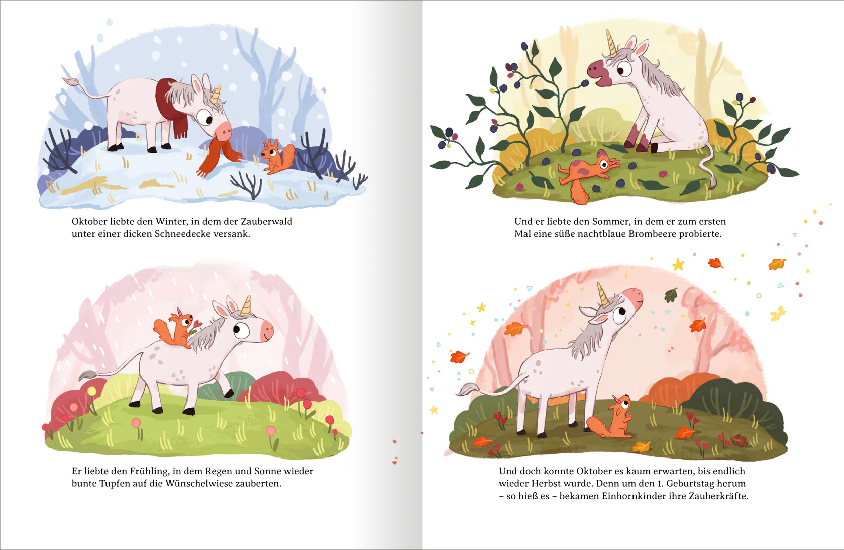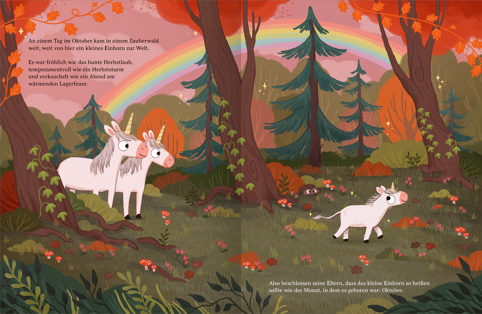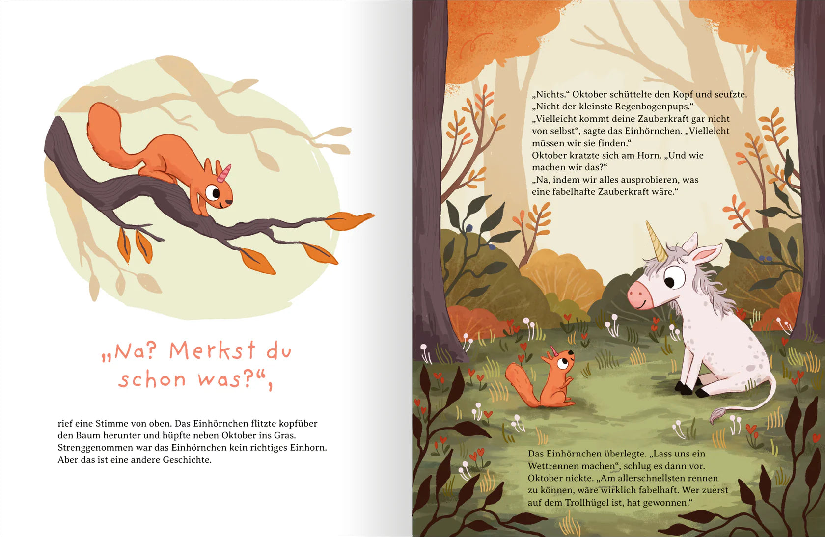 An einem Tag im Oktober wird in einem Zauberwald ein kleines Einhorn geboren. Als sein 1. Geburtstag immer nähherrückt, wird es unruhig. Um den 1. Geburtstag herum, so heißt es nämlich, sollen Einhörner ihre magischen Kräfte entwickeln. Doch die Tage vergehen und es passiert ... nichts. Nicht der kleinste Regenbogenpups.