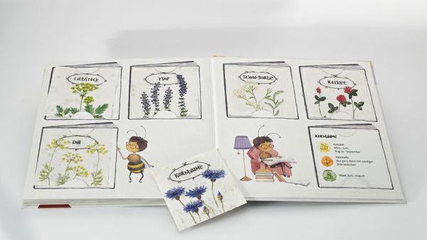 Die sechs im Buch vorkommenden Blumen sind außerdem als Samenkärtchen mit dabei.