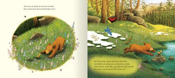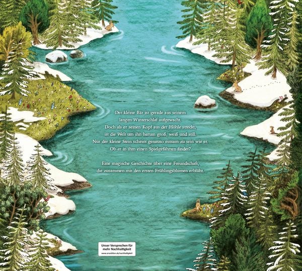 Der kleine Bär ist gerade aus seinem langen Winterschlaf aufgewacht. Als er seinen Kopf aus der Höhle streckt, ist die Welt um ihn herum weiß, groß und still. Das Einzige, was er sieht, ist ein kleiner Stein, der genauso einsam in der verschneiten Landschaft liegt wie er selbst. Er schmiegt ihn fest an sein Fell und sie machen sich in Wald und Wiesen auf die Suche nach Freunden. Dabei finden sie heraus, wie magisch schön es ist, wie die Natur zum Leben erwacht und es langsam Frühling wird ...