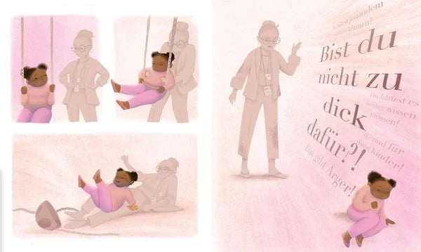 Die Geschichte handelt von einem kleinen Mädchen, das zunächst Lob und Zuspruch erfährt, weil sie "schon so groß ist" - bis genau das plötzlich zum Problem wird. Sie erfährt Mobbing und Ablehnung, weil ihr Körper nicht der vermeintlichen Norm und veralteten Schönheitsidealen entspricht. Mit eindringlichen Bildern gestaltet Vashti Harrison eine Gefühlswelt aus Selbstzweifeln und Einsamkeit, um dann einen kraftvollen Weg der Selbstliebe und Abgrenzung aufzuzeigen, der Kindern Mut macht, sie selbst zu sein. Das Mädchen lernt: Sie selbst entscheidet, wer sie ist. Und welche Worte sie beschreiben dürfen.