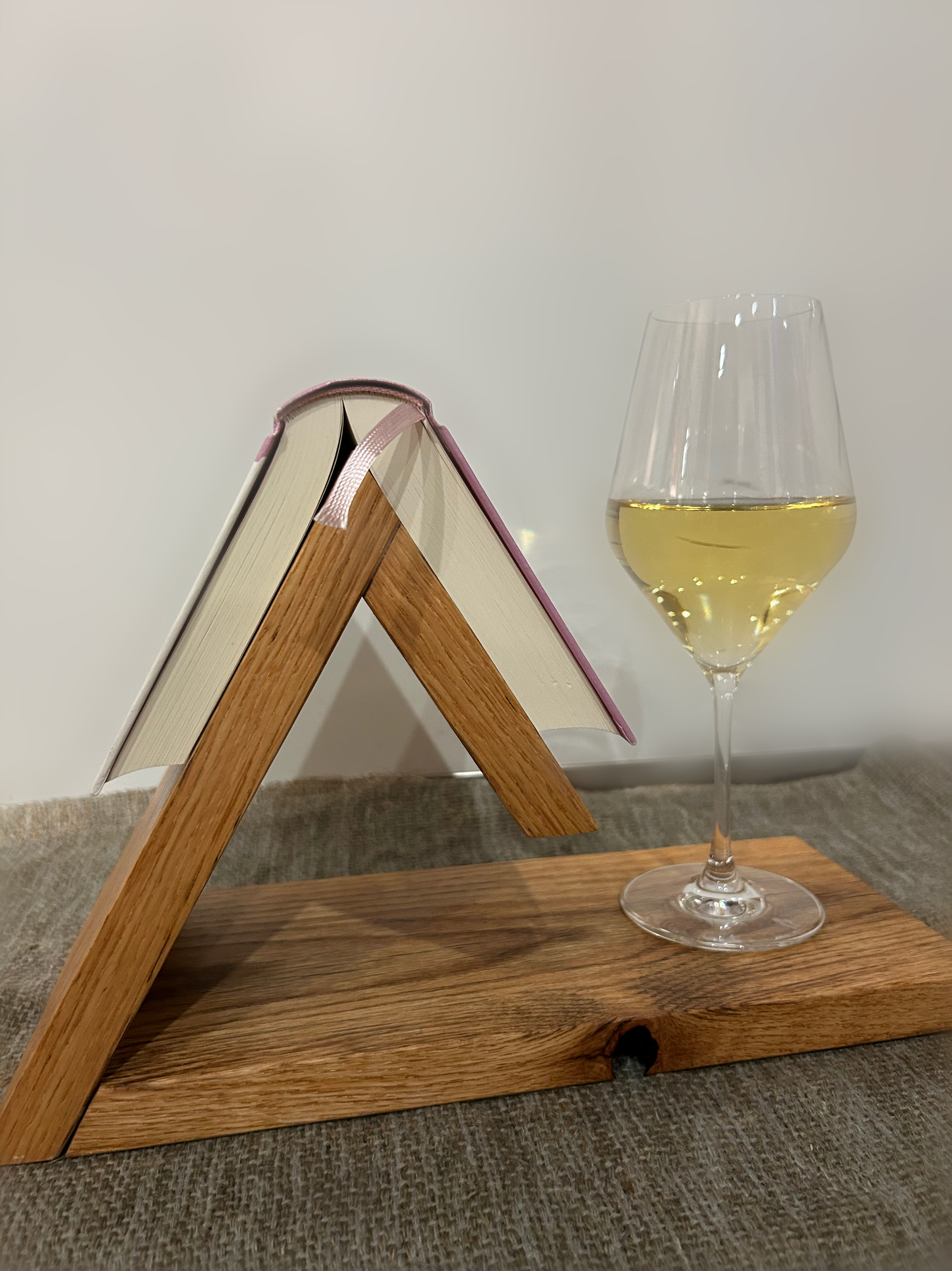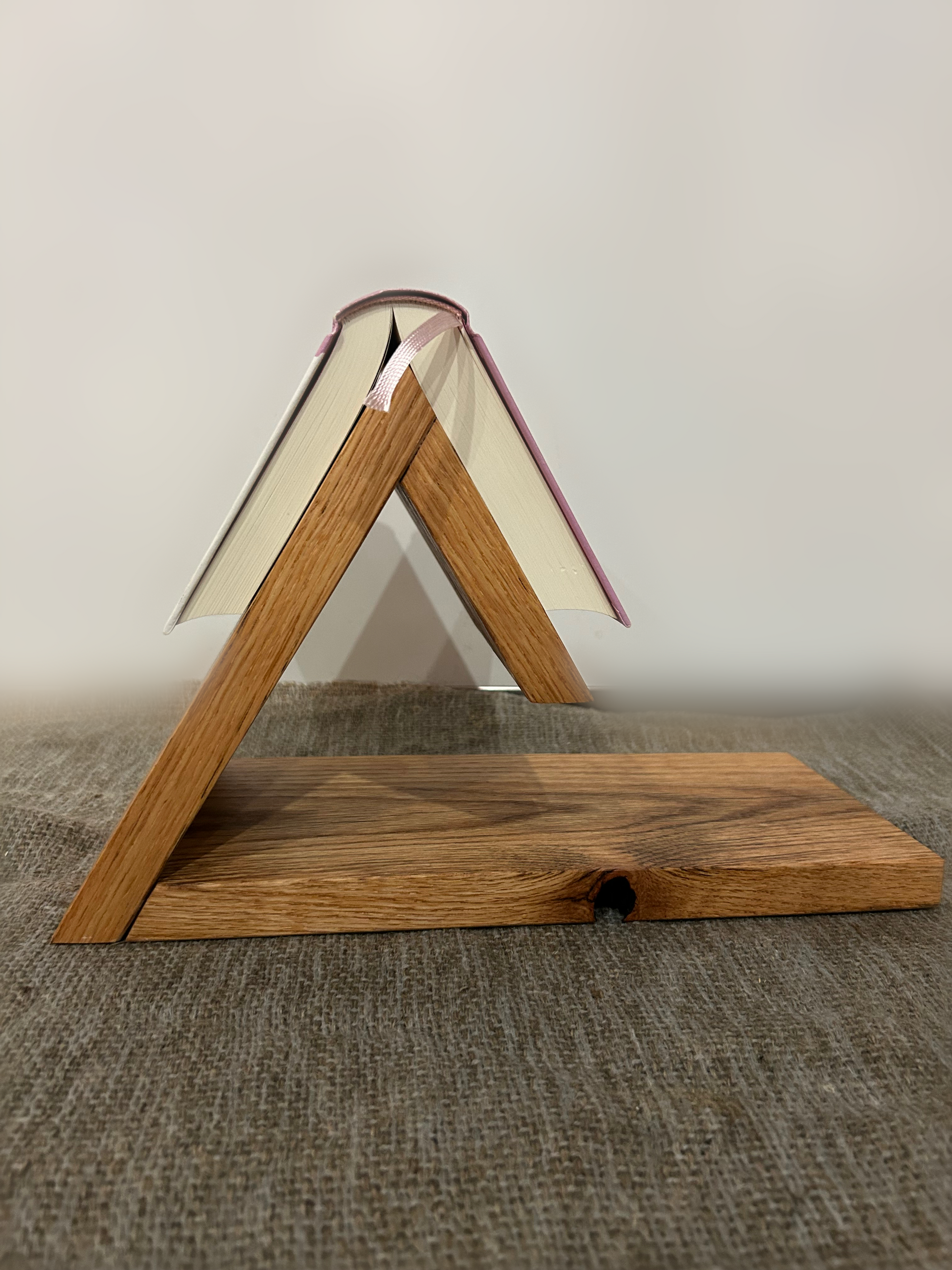Dieser Buchhalter aus massivem Eichenholz verbindet klares Design mit ehrlicher Handarbeit. Die ruhige, schräge Konstruktion hält Bücher sicher geöffnet oder präsentiert sie stilvoll – ohne abzulenken, ohne Schnickschnack.