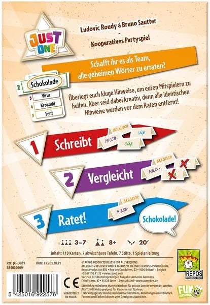 Just One ist ein kooperatives Partyspiel, bei dem alle zusammen gegen das Spiel spielen. Das Ziel ist es, gemeinsam möglichst viele der 13 geheimen Wörter zu erraten. In jeder Runde versucht einer als aktiver Spieler ein geheimes Wort zu erraten. Dabei helfen die anderen Spieler, indem sie verdeckt und ohne sich abzusprechen je einen Hinweis auf ihre Tafeln schreiben.