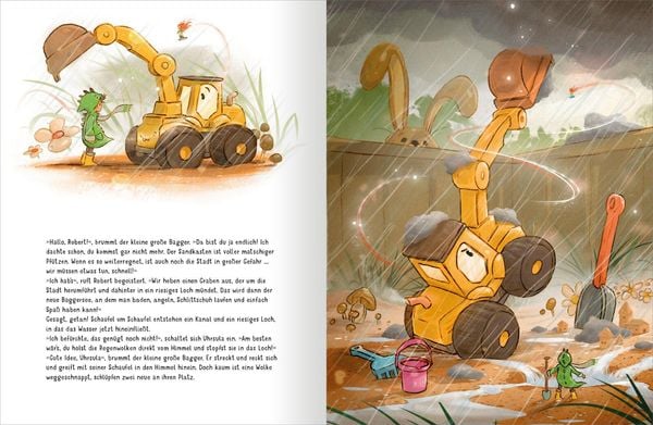 Bevor auch noch die Stadt in seinem Sandkasten im Regen versinkt, versucht er mit dem großen gelben Bagger die Regenwolken vom Himmel zu pflücken.