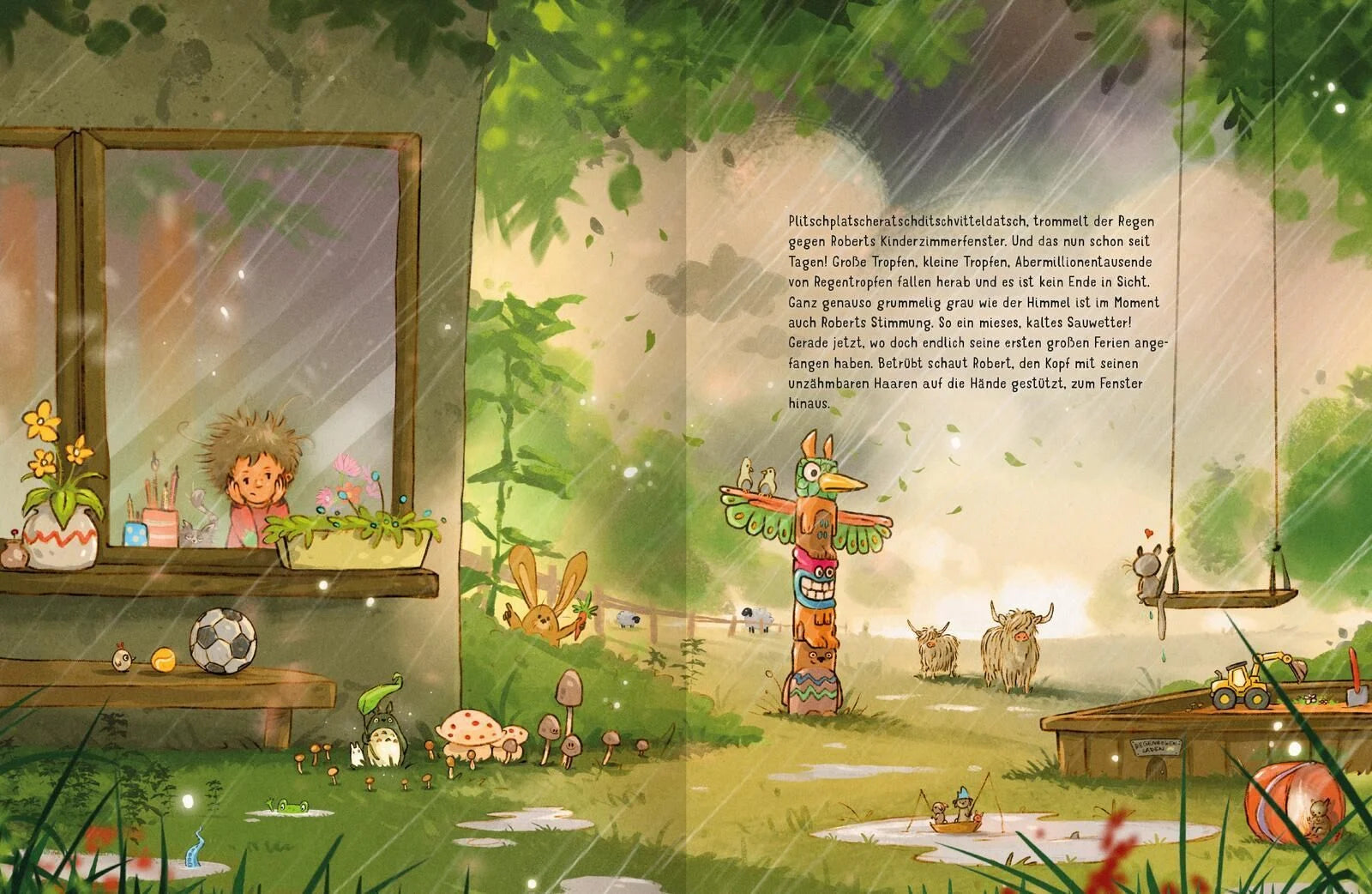 , trommelt der Regen gegen Roberts Kinderzimmerfenster. Und das nun schon seit Tagen! Ganz genauso grummelig grau wie der Himmel ist im Moment auch Roberts Stimmung. So ein mieses, kaltes Sauwetter! Gerade jetzt, wo doch endlich seine ersten großen Ferien angefangen haben.