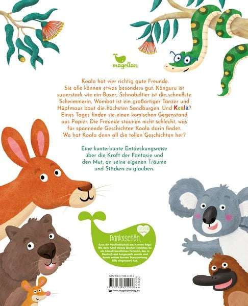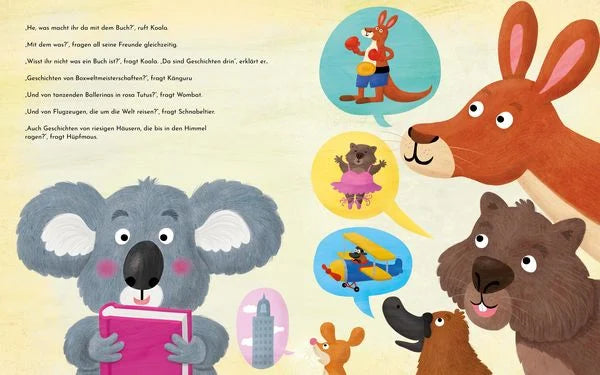 Eines Tages finden die Freunde einen komischen Gegenstand aus Papier. Die Freunde staunen nicht schlecht, was für spannende Geschichten Koala darin findet. Wo hat Koala denn all die tollen Geschichten her?