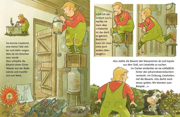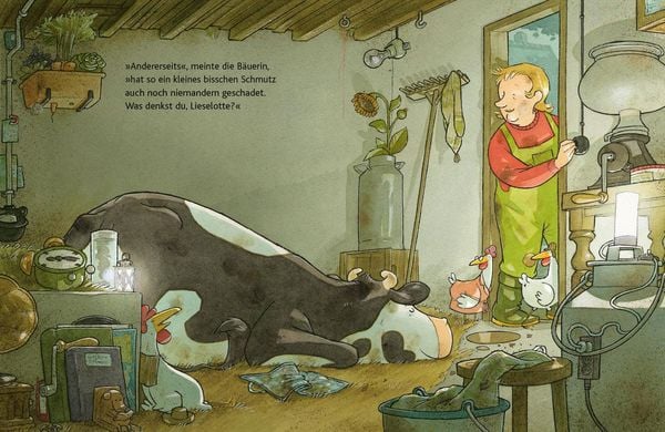 Lieselotte und ihre Freunde vom Bauernhof haben sich beim Spielen ordentlich schmutzig gemacht. Da gibt es kein Pardon. Vor dem Schlafengehen müssen alle in der Badewanne noch einmal kräftig abgeschrubbt werden. Auch Lieselotte. Aber die will nicht. Sie versucht es heimlich mit einer kleinen Katzenwäsche. Die Bäuerin kommt ihr jedoch auf die Schliche. Und dann wird es herrlich turbulent. Beide haben riesigen Spaß mit dem Rasensprenger und beim Spritzen mit dem Gartenschlauch. Schließlich muss sogar die Bäuerin in die Badewanne, denn die ist in den Matsch geplumpst.