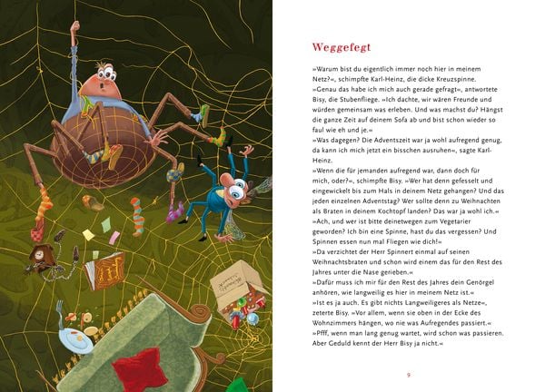 Eines schönen Tages werden die grummelige Spinne Karl-Heinz und die Stubenfliege Bisy unsanft aus ihrem gemütlichen Netz geschüttelt. Schnell wird den beiden klar, was los ist: »Mit Beginn der warmen Jahreszeit wütet in vielen Wohnungen der sogenannte Frühjahrsputz. Dabei werden Insekten und Spinnen einfach weggefegt.« Auch Karl-Heinz und Bisy verlassen fluchtartig das Wohnzimmer, um in der großen grünen Weite des Gartens ein ruhiges Plätzchen für ein neues Zuhause zu finden. Eine spannende Suche beginnt, bei der das ungleiche Duo auf verschiedene Gartenbewohner trifft: nervige Ameisensoldaten, hilfsbereite Kellerasseln, wichtigtuerische Blattwanzen und gefährliche Libellen. Karl-Heinz und Bisy erleben den Garten mit all seinen Abenteuern und Gefahren.