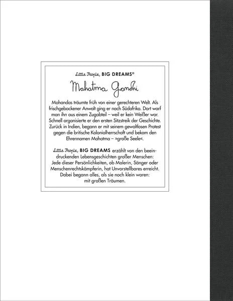 Mohandas wuchs in der indischen Stadt Porbandar auf und träumte früh von einer gerechteren Welt. Als frischgebackener Anwalt ging er nach Südafrika. Dort warf man ihn aus dem Zugabteil der 1. Klasse - weil er kein Weißer war. Daraufhin organisierte er den ersten friedlichen Sitzstreik aller Zeiten. Zurück in Indien setzte er sich mit friedlichen Methoden für ein Ende der britischen Kolonialherrschaft ein und bekam den Ehrennamen Mahatma - »große Seele«.