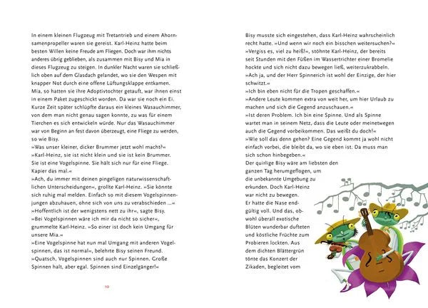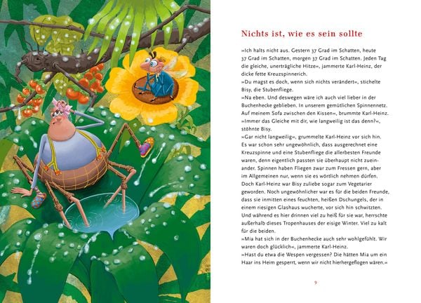 Puh, ist das heiß hier! Und mitten im Dschungel den perfekten Platz für ein neues Netz zu finden, ist für Kreuzspinne Karl-Heinz und Stubenfliege Bisy auch keine einfache Aufgabe. Ihre Adoptivtocher, die Vogelspinne Mia, ist ihrer eigenen Wege gegangen und nun müssen die zwei Freunde allein in den Tropen überwintern.