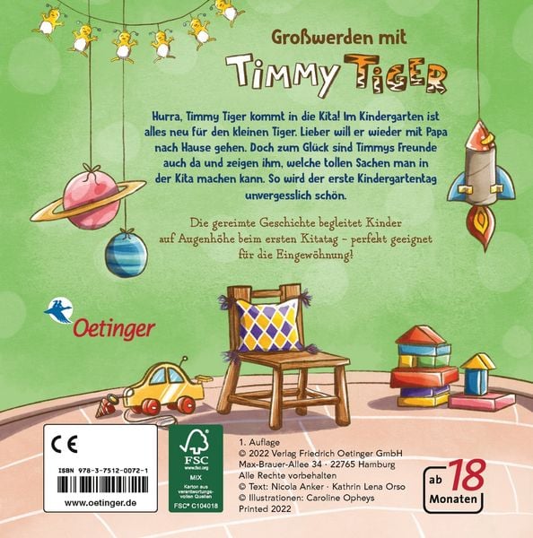 "Timmy Tiger. Ich komme in die Kita!" ist ein herzerwärmendes Pappbilderbuch, das kleine Kinder liebevoll auf ihren ersten Tag im Kindergarten vorbereitet. Kathrin Lena Orsos und Nicola Anker erzählen die Geschichte von Timmy Tiger, der zuerst zögerlich ist, die Kita zu betreten. Doch dank der Unterstützung seiner Freunde entdeckt Timmy schnell die Freude am gemeinsamen Spielen und Lernen. Dieses Buch, reich an Reimen und liebevollen Illustrationen, ist der perfekte Begleiter für Kinder und Eltern, um den wichtigen Schritt des Kita-Beginns gemeinsam zu meistern.