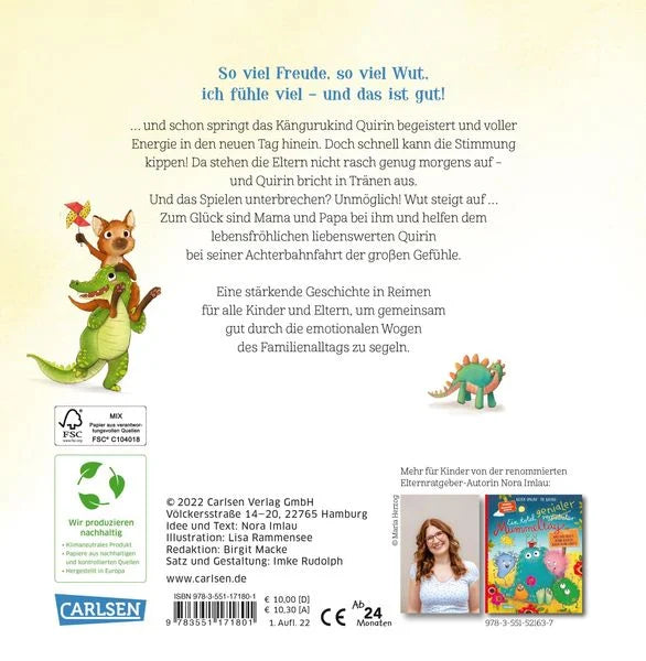 Es ist noch dunkel und schon springt das Kängurukind Quirin begeistert und voller Energie in den neuen Tag hinein. Doch schnell kann die Stimmung kippen! Da stehen die Eltern nicht rasch genug morgens auf - und Quirin bricht in Tränen aus. Dort heißt es: Anziehen! Losgehen! Und wütend springt Quirin davon. Dann zwickt die Hose, stören die Knöpfe und draußen erwartet ihn all das Schnelle, Schrille, Stinkige! NEIN! Quirin steckt in einer Achterbahnfahrt der großen Gefühle. Zum Glück weiß Mama Rat: Beutel auf, Quirin rein, Beutel zu, Quirin kommt zur Ruh! Co-Regulation á la Känguru!