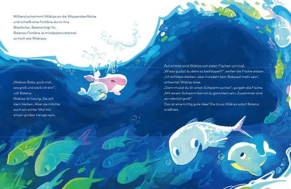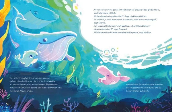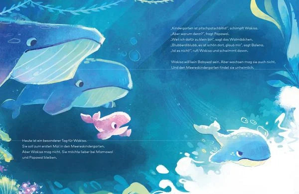 Wakisa will nicht wachsen.Sie ist die Allerkleinste in ihrer Walfamilie und findet das richtig gut. So passt sie perfekt in ihre Lieblingshöhle - und wer klein ist, der muss auch nicht in den Kindergarten. Wakisa möchte nämlich viel lieber bei Mama und Papa bleiben.