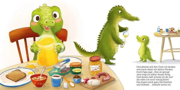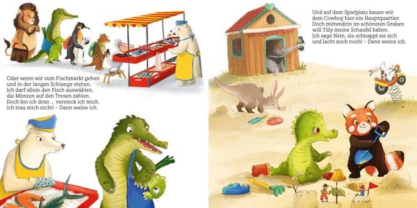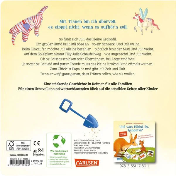 Juli, das kleine Krokodil, hat gar keine dicke Krokodilshaut, sondern ist sehr durchlässig. Schnell füllen sich die Augen des Krokodilkindes mit Tränen. Ob bei Missgeschicken oder Übergängen, bei Angst und Wut, ja sogar bei Mitleid und purer Freude muss das kleine Krokodilkind oftmals weinen. Zum Glück ist Papa da und gibt Juli Zeit, Raum und Halt. Denn er weiß ganz genau, dass Tränen rollen, wie sie wollen. Das Weinen ist für ein so wunderbar empfindsames Kind wie Juli ein wichtiges Ventil, um sein Erlebtes und Gefühltes zu verarbeiten.