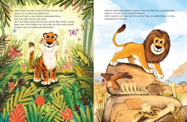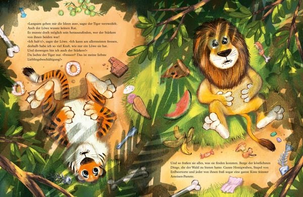 Schon immer, seit jeher, wollen der Tiger und der Löwe wissen, wer von ihnen der Stärkere ist. Der Löwe ist felsenfest davon überzeugt, dass er der Stärkste ist. Aber: Das ist der Tiger auch! Dringend muss die Sache geklärt werden und so machen sich die beiden auf den Weg, um sich zu treffen. Auf einer Lichtung im Wald werden schließlich die verschiedensten Wettbewerbe ausgetragen: Wer kann weiter springen, mehr tragen oder tiefer tauchen? Doch einen Gewinner festzulegen ist gar nicht so leicht! Und wie heißt es doch so schön: "Wenn zwei sich streiten, freut sich ..." Mit einem überraschend lustigen und vielsagenden Ende, bei dem es nicht auf die äußere Stärke ankommt!
