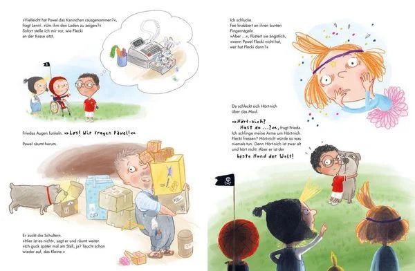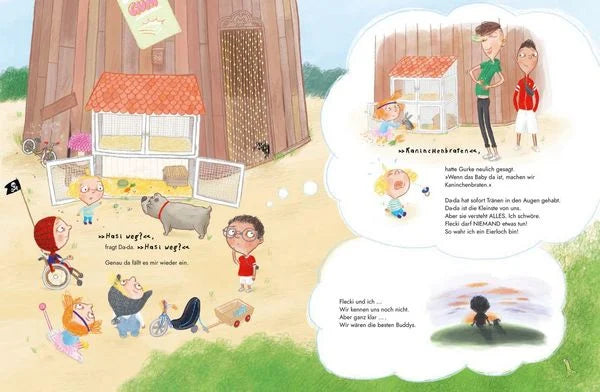 Die Eierlöcher, die coole Kinderbande, freut sich auf das neue Kaninchen bei Tante Ranguun. Es ist frisch eingezogen in den kleinen Kaninchenstall direkt beim Kiosk. Flecki ist total flauschig und alle wollen es mal auf den Arm nehmen. Aber was ist das? Der Stall ist leer, Flecki ist verschwunden! Haben die Großen es heimlich geklaut? Das wäre gemein! Oder meint Gurke das mit dem Hasenbraten etwa ernst? Das darf nicht sein, sie müssen Gurke davon abhalten. Ausgerechnet Da-da, die Kleinste bei den Eierlöchern, bringt die Bande auf die richtige Spur und Flecki kehrt wohlbehalten zurück in den Stall.