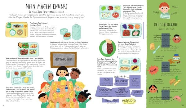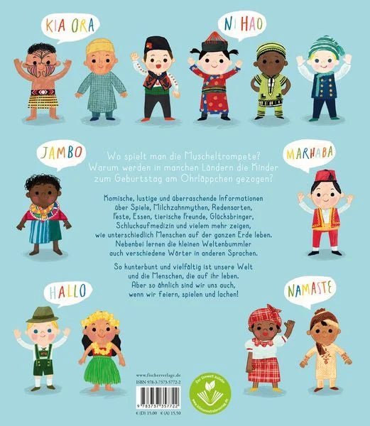 Egal welche Hautfarbe, welche Religion und welche Nationalität - rund um die Welt gibt es faszinierende Traditionen zu Anlässen und Ereignissen, die wir alle teilen. Warum werfen Kinder in Malawi und Simbabwe ihre Milchzähne aufs Dach? Wo spielt man die Muscheltrompete? Warum werden in manchen Ländern die Kinder zum Geburtstag am Ohrläppchen gezogen? Ein buntes Sachbilderbuch, randvoll mit komischen, lustigen, überraschenden Informationen über Spiele, Milchzahnmythen, Redensarten, Feste, Essen, tierische Freunde, Glücksbringer, Schluckaufmedizin und vielem mehr. Nebenbei lernen die kleinen Weltenbummler auch verschiedene Wörter in anderen Sprachen wie "Hallo", "Mama" und "Papa". So kunterbunt und vielfältig ist unsere Welt. Aber so ähnlich sind wir uns auch, wenn wir feiern, spielen und lachen!