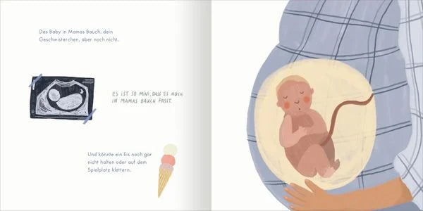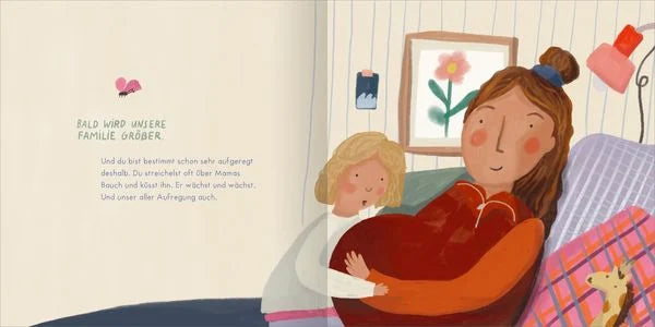 "Bald wird unsere Familie größer. Und du bist bestimmt schon sehr aufgeregt deshalb. Du streichelst oft über Mamas Bauch und küsst ihn. Er wächst und wächst. Und unser aller Aufregung auch."